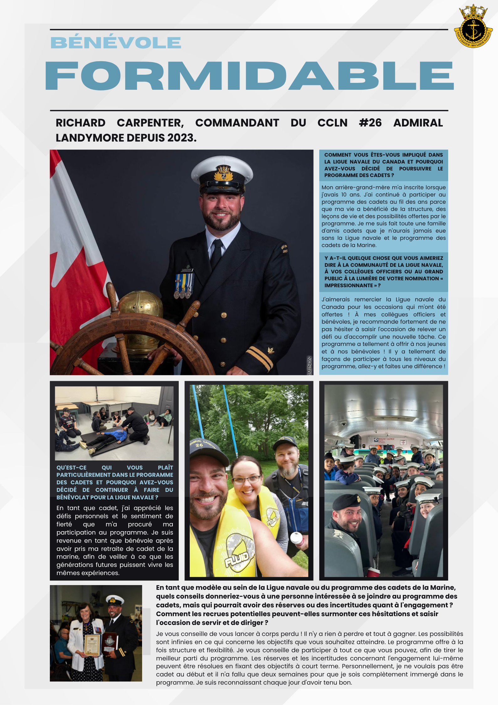 J'aimerais remercier la Ligue navale du Canada pour les occasions qui m'ont été offertes ! À mes collègues officiers et bénévoles, je recommande fortement de ne pas hésiter à saisir l'occasion de relever un défi ou d'accomplir une nouvelle tâche. Ce programme a tellement à offrir à nos jeunes et à nos bénévoles ! Il y a tellement de façons de participer à tous les niveaux du programme, allez-y et faites une différence!